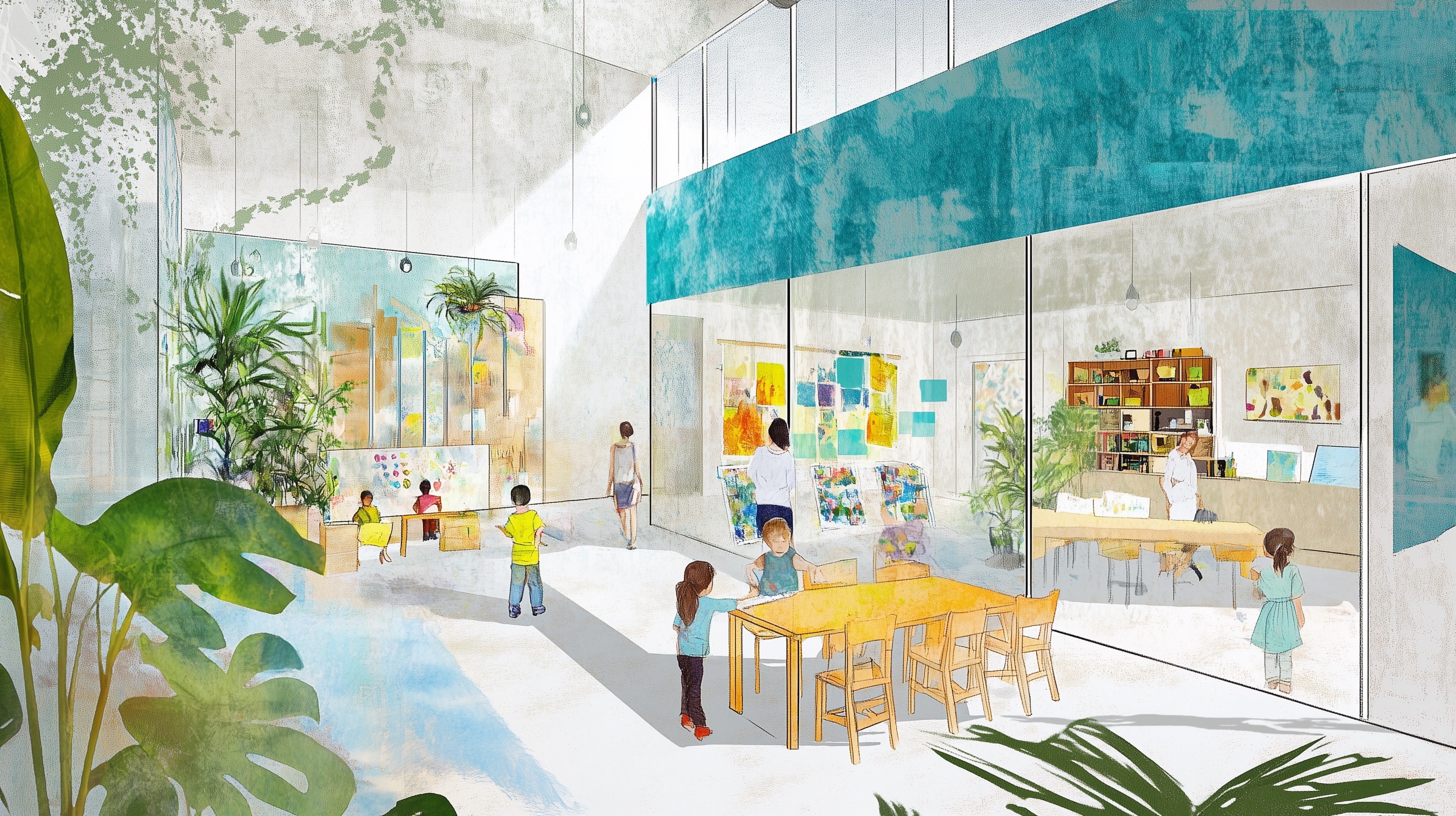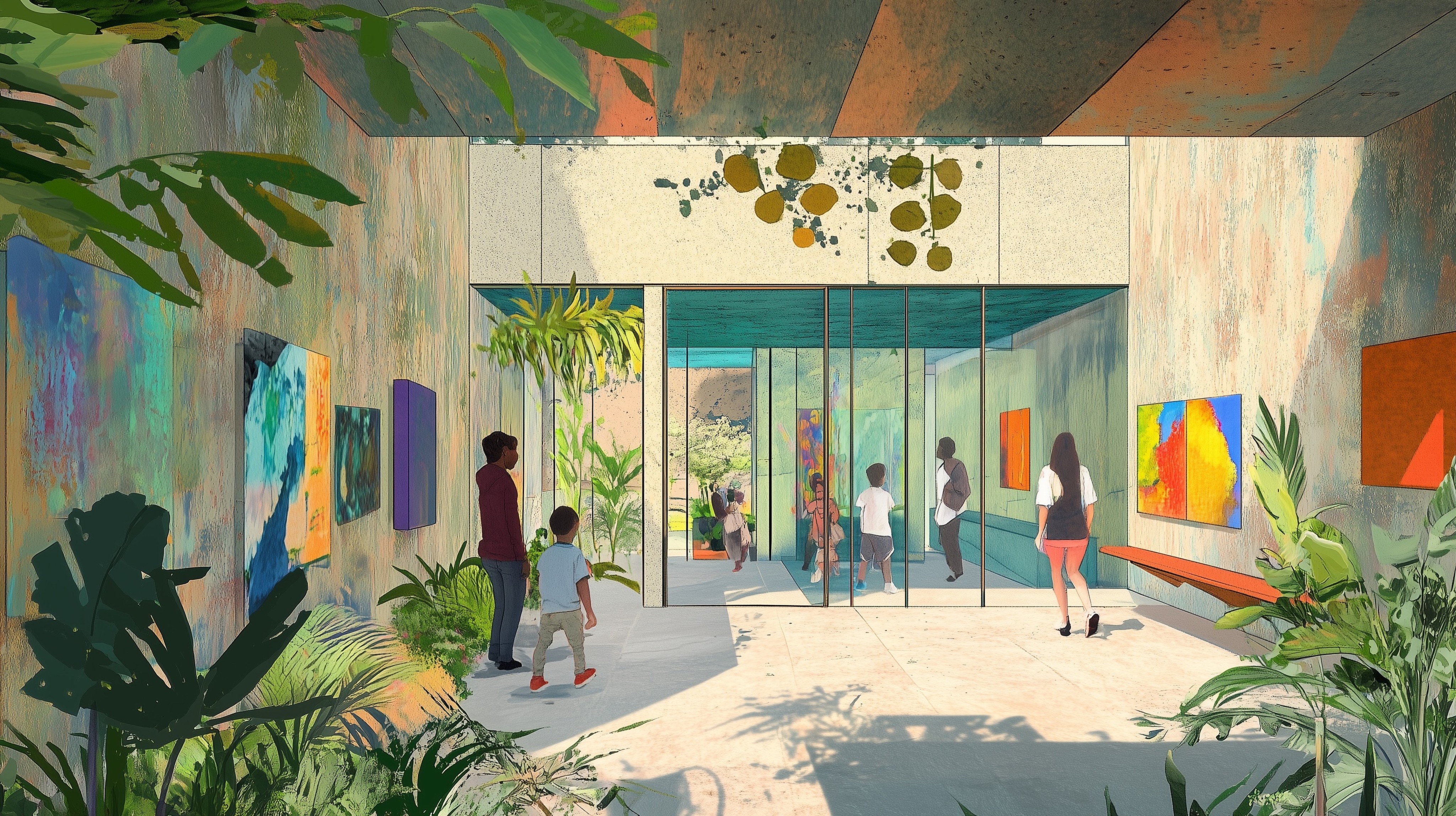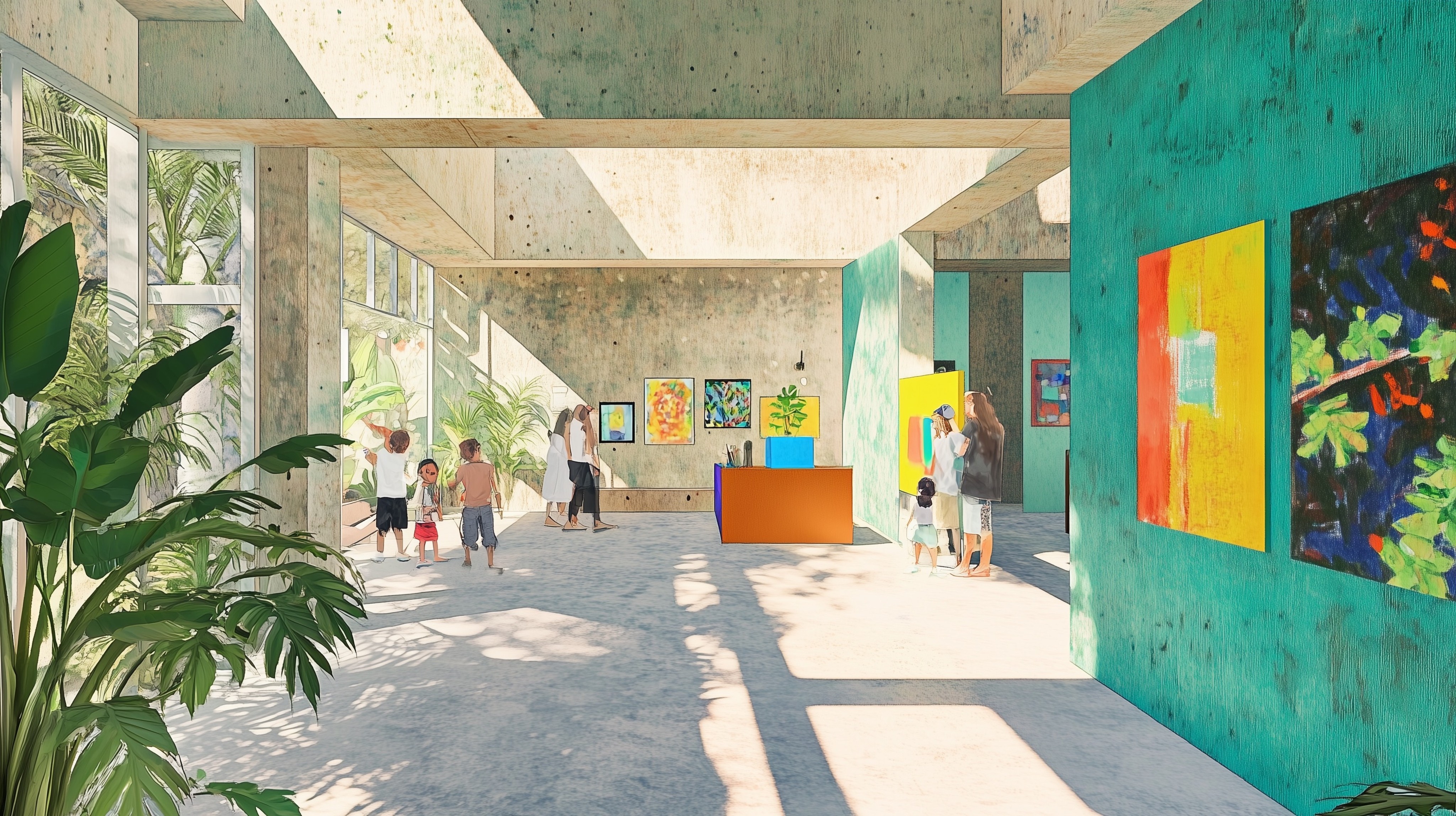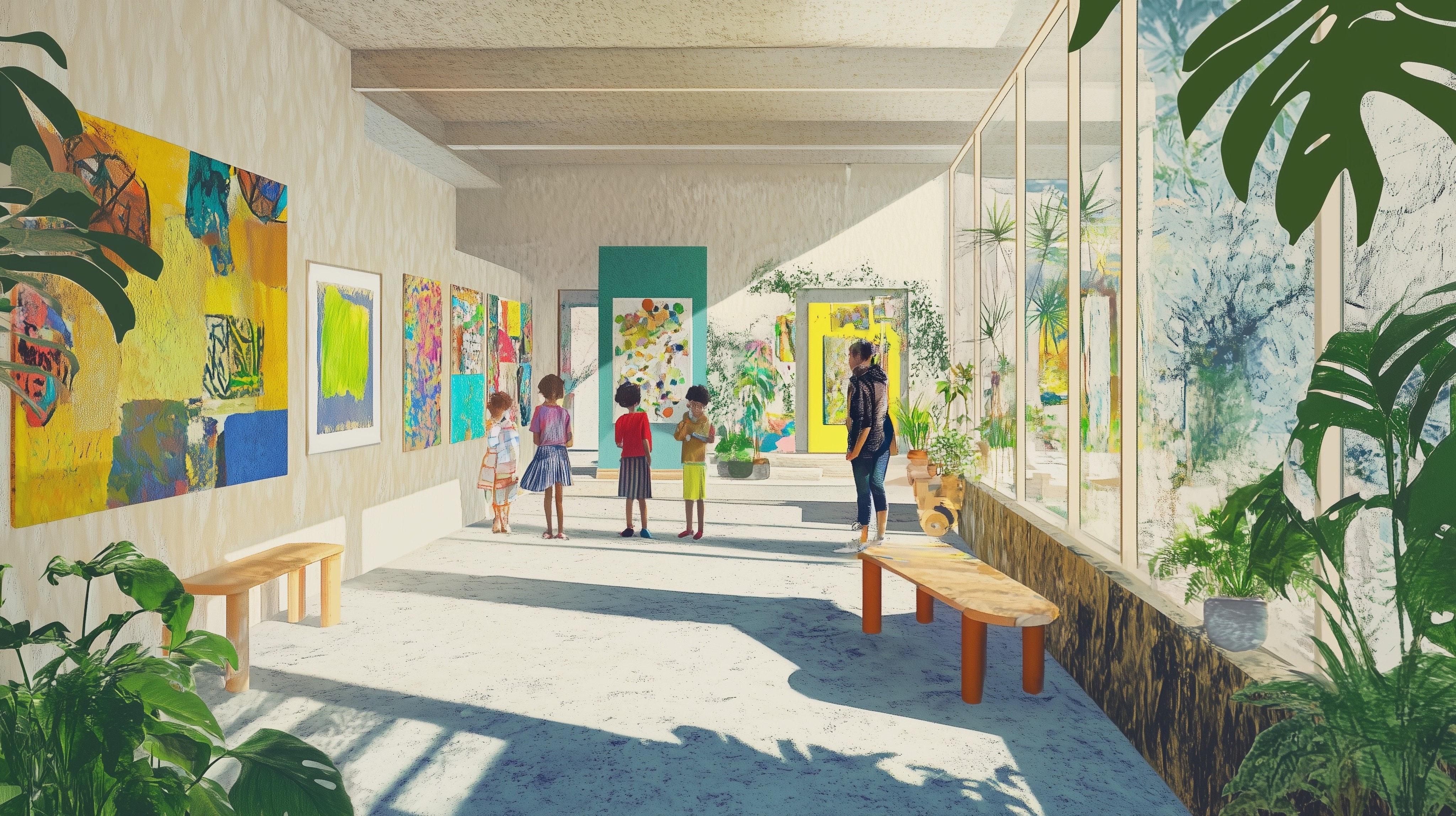 The design of the Art Room focuses solely on sustainable and functional design. The building is crafted from an intriguing blend of materials and textures. Its structure plays with different forms of glass, cement, reclaimed wood, and polished stone, creating an architectural masterpiece that feels both organic and modern. The space inside works like an eco-system, filled with lush greenery and water fountains. With accessibility in mind, the building will predominately be on the ground level, however there are elevators and lifts to the second floor if needed.