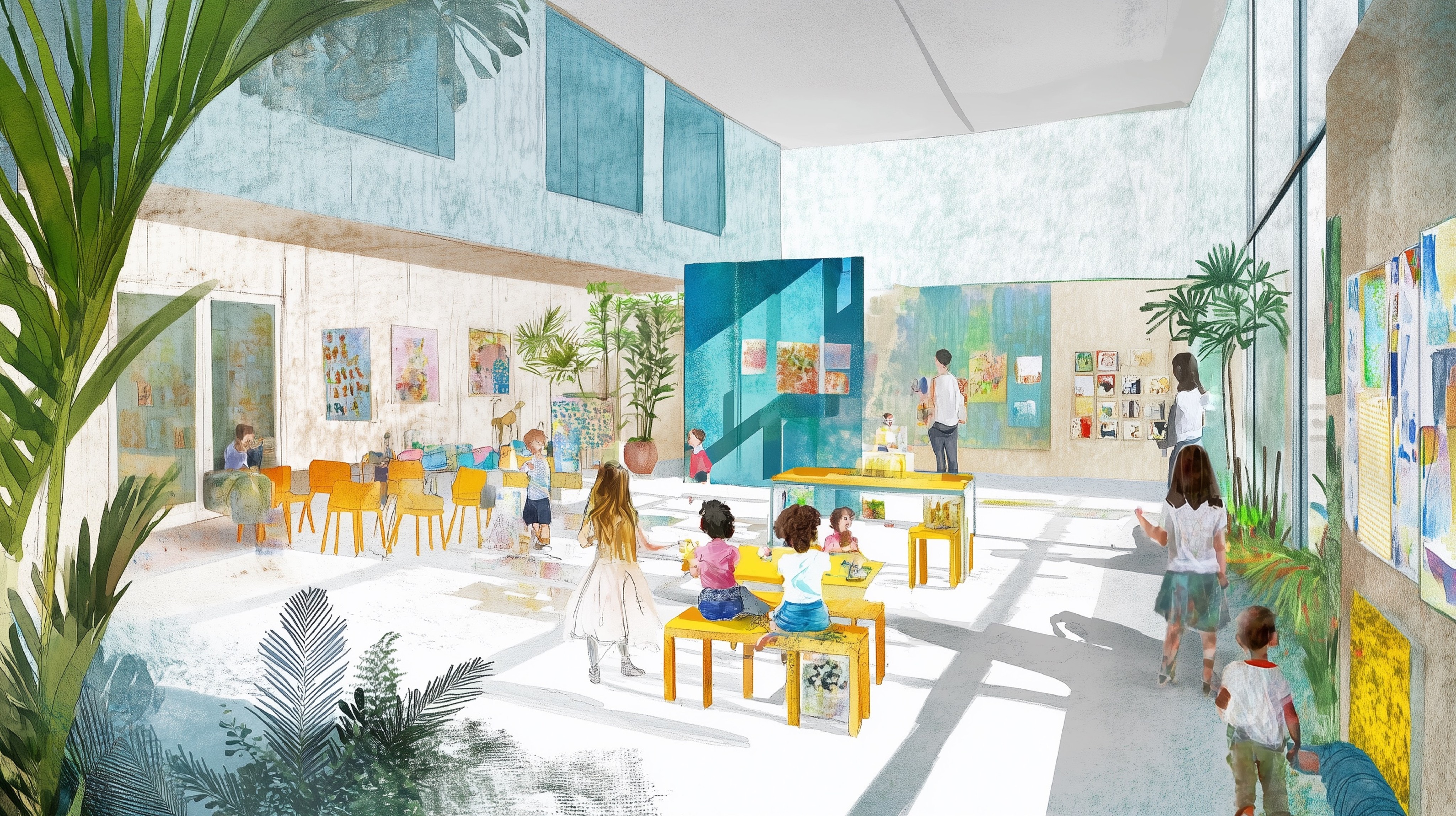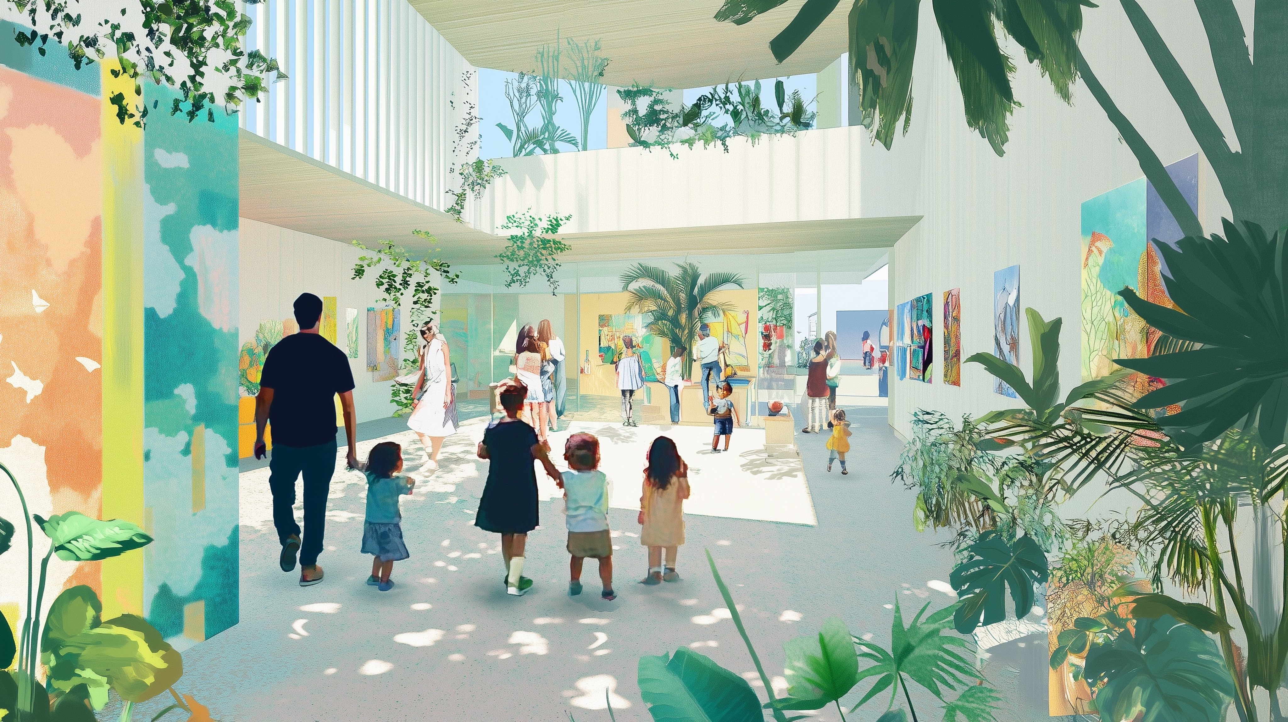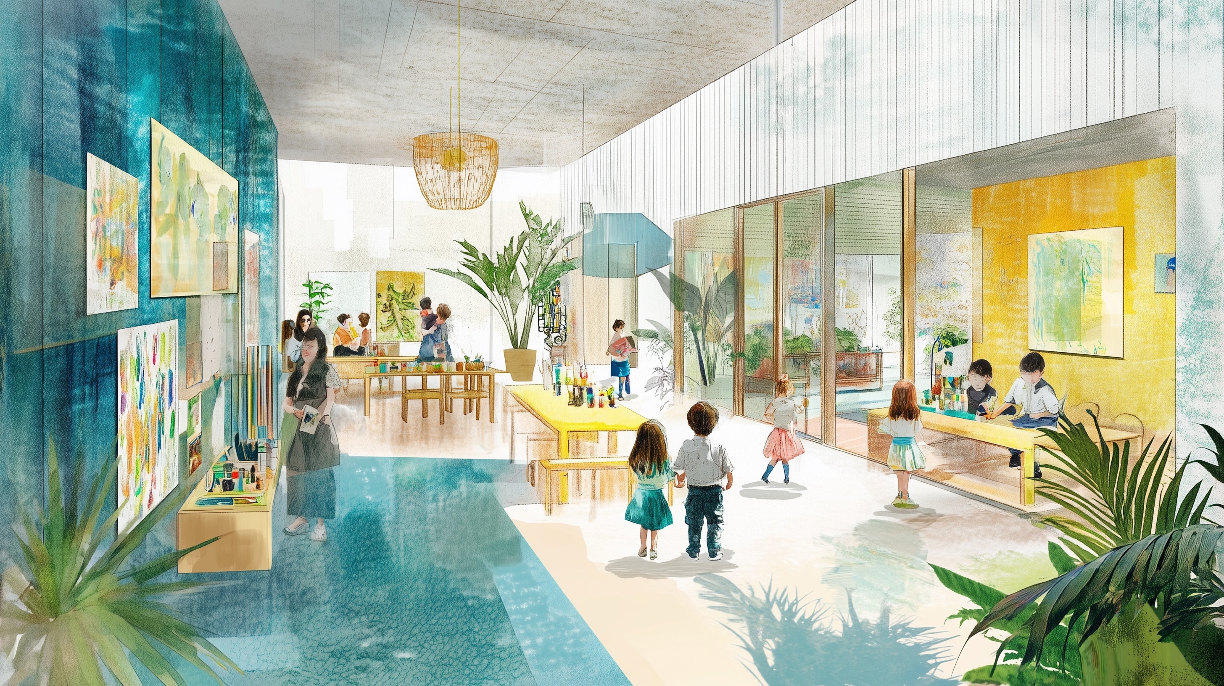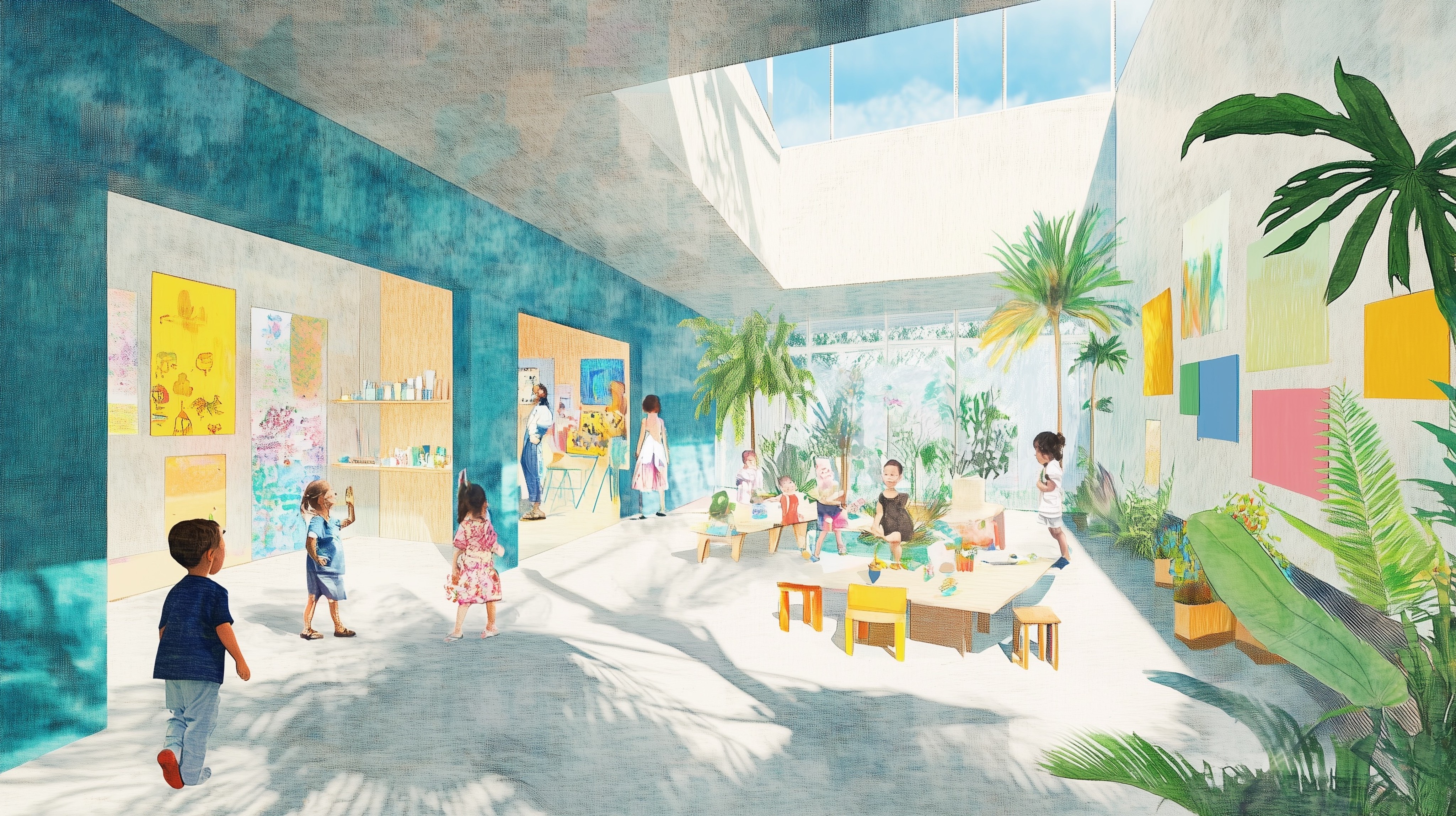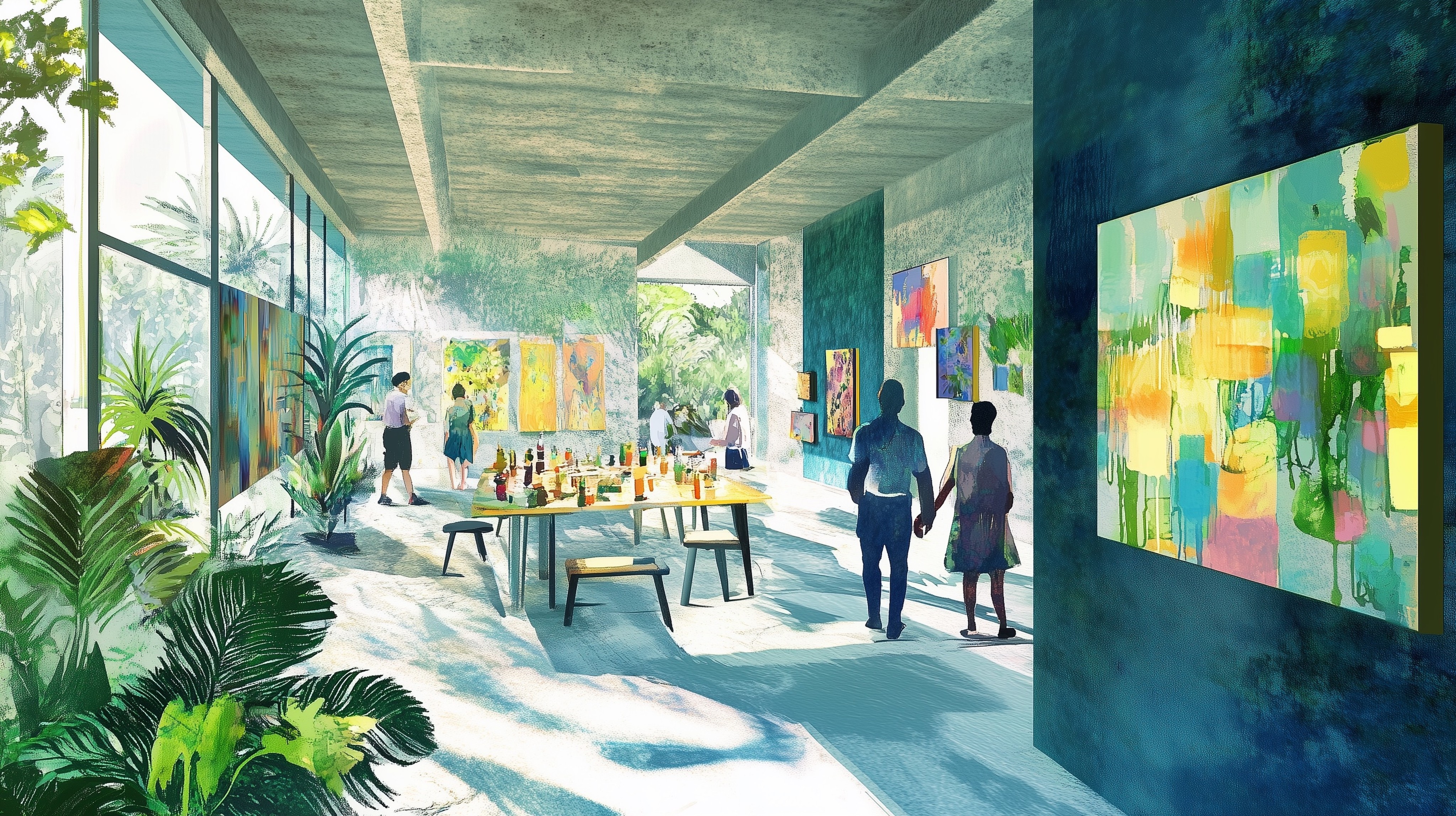 The design of the Art Room focuses solely on sustainable and functional design. The building is crafted from an intriguing blend of materials and textures. Its structure plays with different forms of glass, cement, reclaimed wood, and polished stone, creating an architectural masterpiece that feels both organic and modern. The space inside works like an eco-system, filled with lush greenery and water fountains. With accessibility in mind, the building will predominately be on the ground level, however there are elevators and lifts to the second floor if needed.